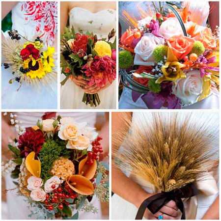 Оглянитесь вокруг и вы увидите, что осень сама подскажет вам идеи для аксессуаров и декора. Так, для букета невесты хорошо подойдут георгины, бордовые и лимонные орхидеи, герберы, оранжевые каллы и подсолнухи. Также можно использовать декоративные тыквочки, яблочки, грозди калины, сухостои и спелые колоски пшеницы.